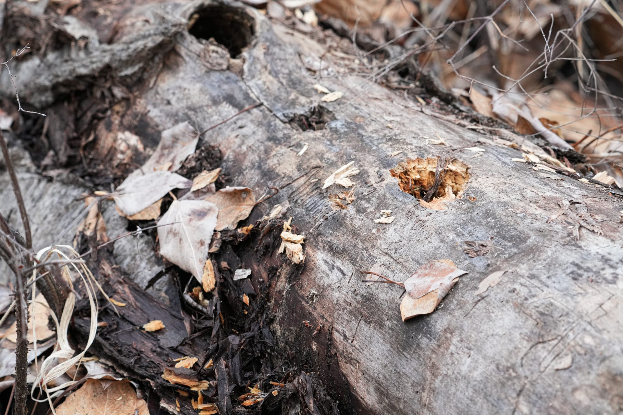 You can always tell where pileated woodpeckers have been active because they leave behind pieces of wood that are 1-4 inches long. Photos by David Lukas