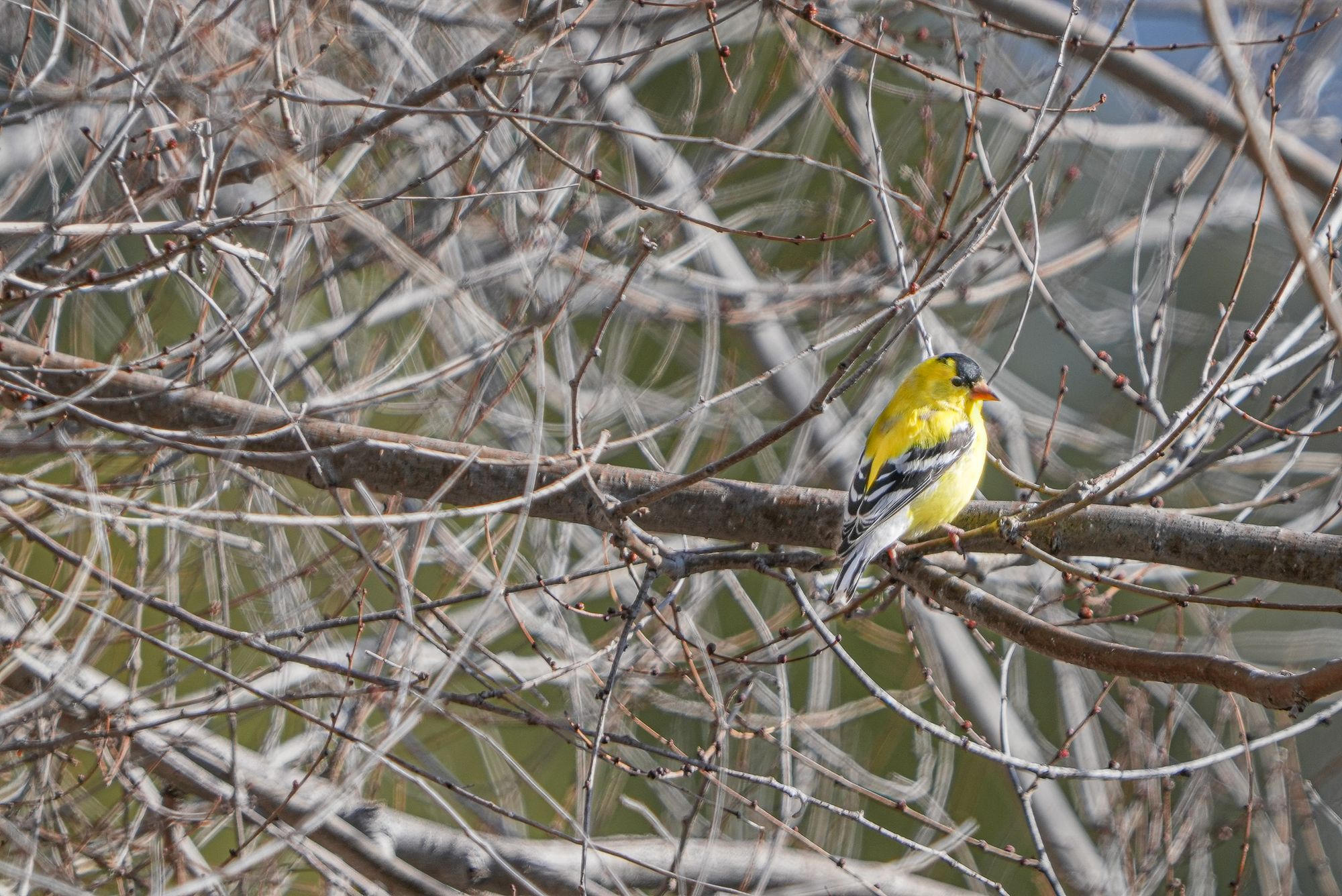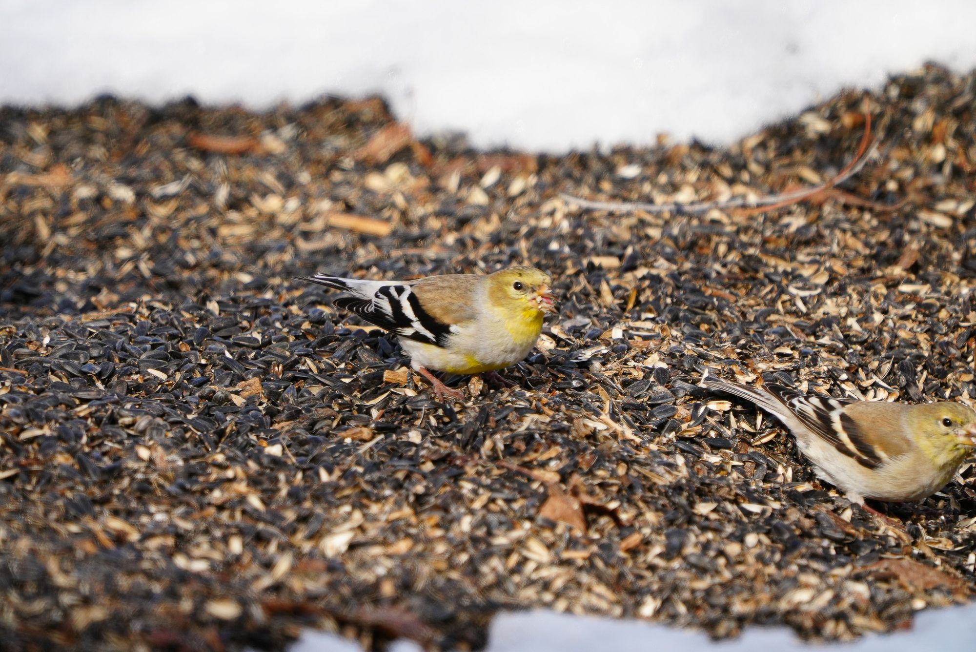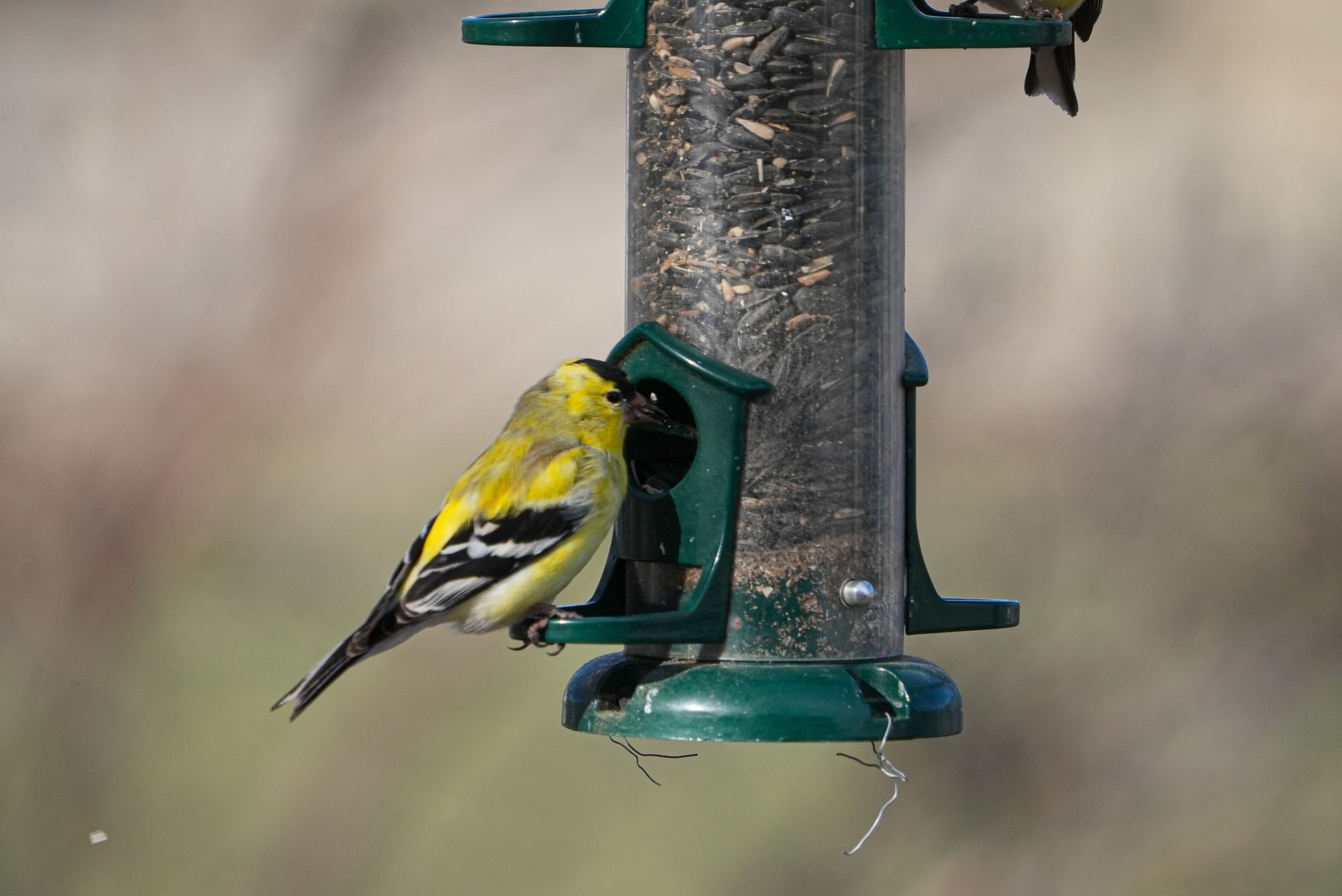 Another notable change has been the abrupt transformation of American goldfinches as they molt from their drab winter plumage into their brilliant lemon-yellow breeding colors. Notice in these pictures that they only molt their body feathers, while their wing and tail feathers remain unchanged.