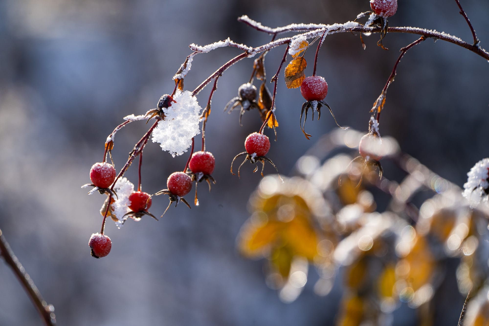 Red squirrels use an increasing snowpack to reach rose hips on high thorny branches that they can't otherwise access. Photos by David Lukas