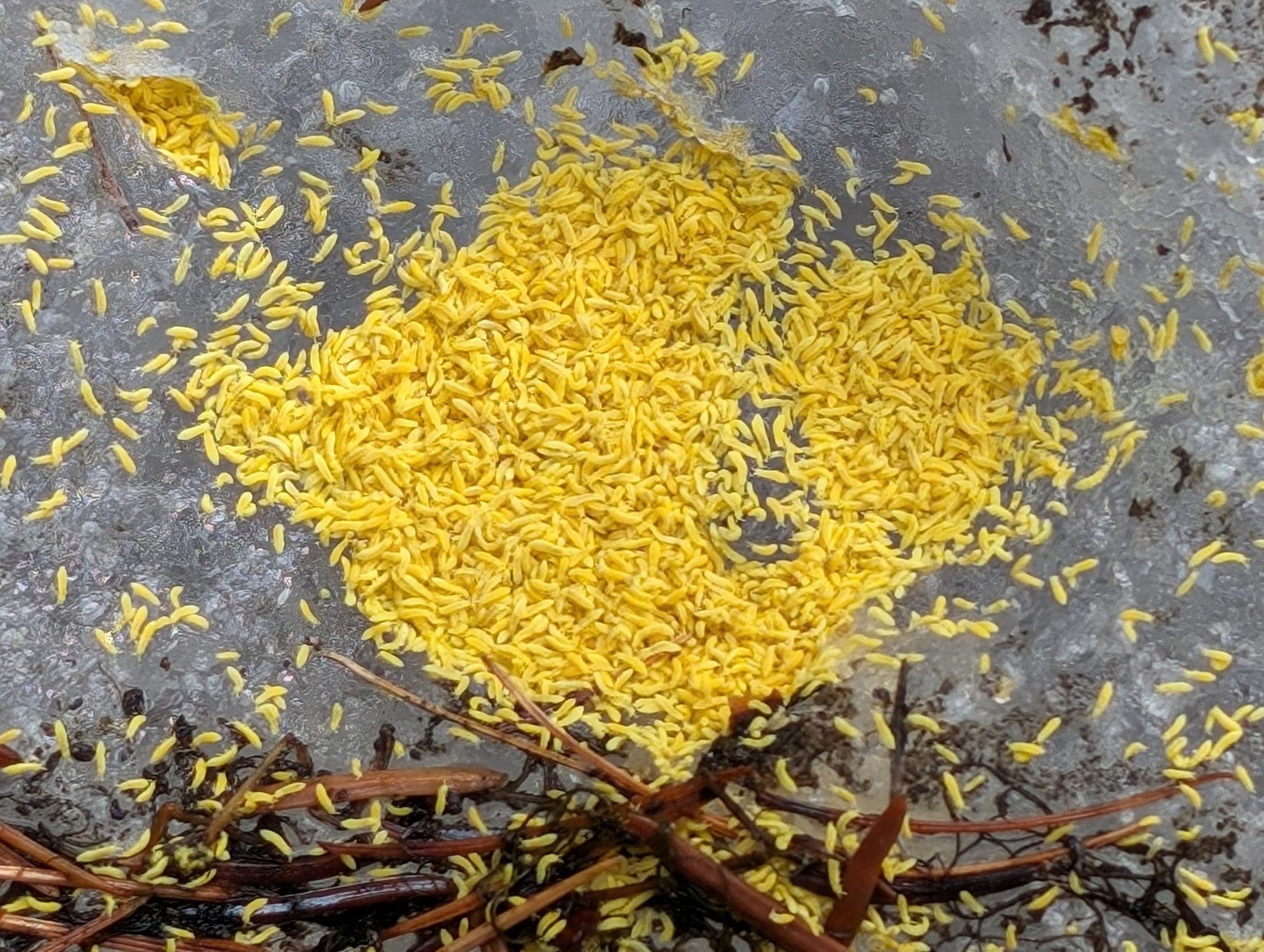 One telltale sign of this transformation is the mass emergence of springtails (also called snow fleas because of their jumping behavior) that feast on algae in the snow. Millions of springtails emerge and begin moving towards open patches of ground where they gather in dense mats to breed. Even though springtails average about 3mm long, they can travel up to two miles in ten days by hopping steadily in one direction in search of these mating swarms.