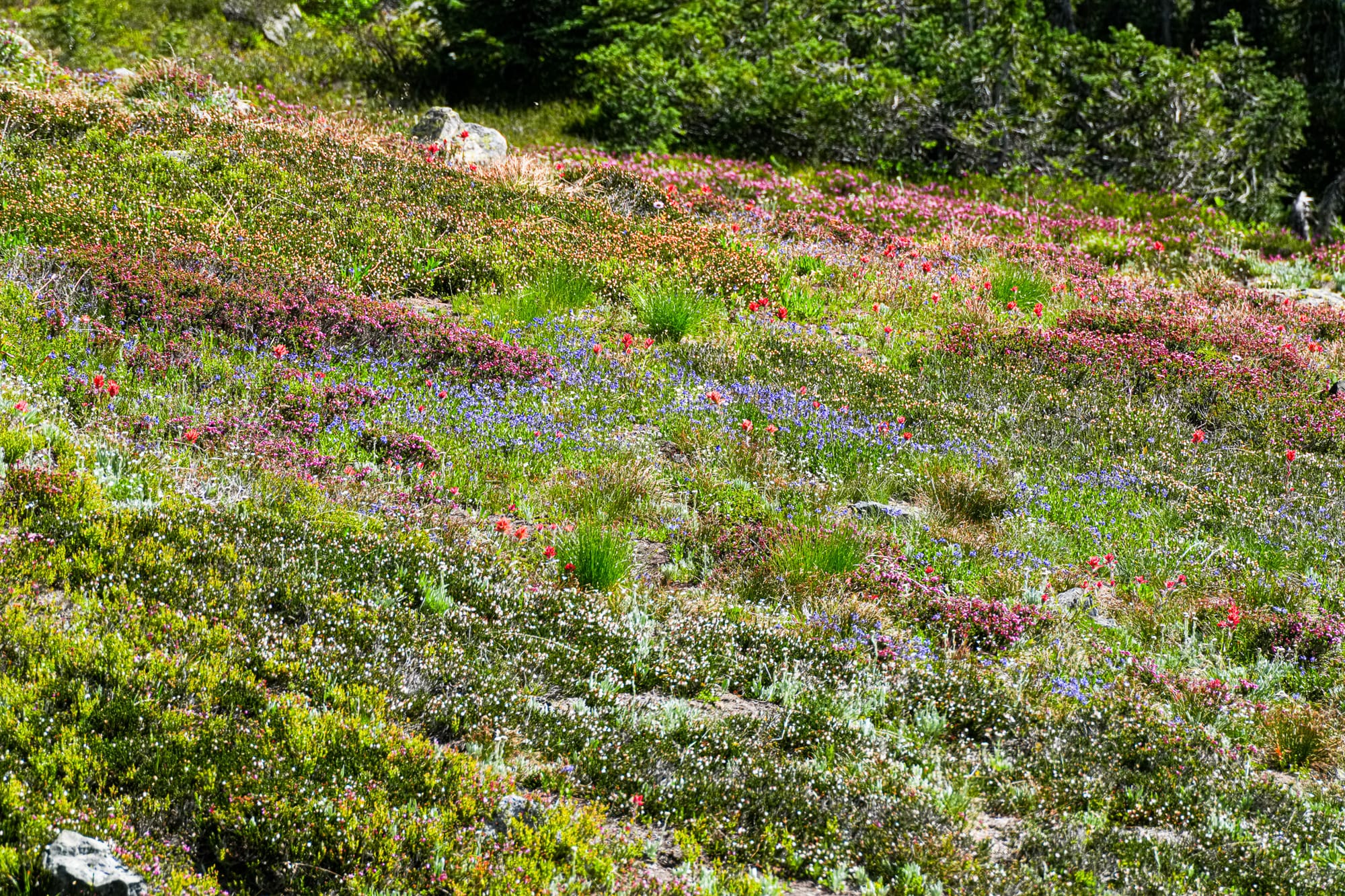 Over the past couple weeks I've come to realize there are two distinct experiences when looking for flowers in the mountains. One is to head for open, sunny meadows on the highest slopes, where you'll find fabulous displays of red and white heather, multiple types of paintbrush, sandwort, lupine, speedwell, and cinquefoil.