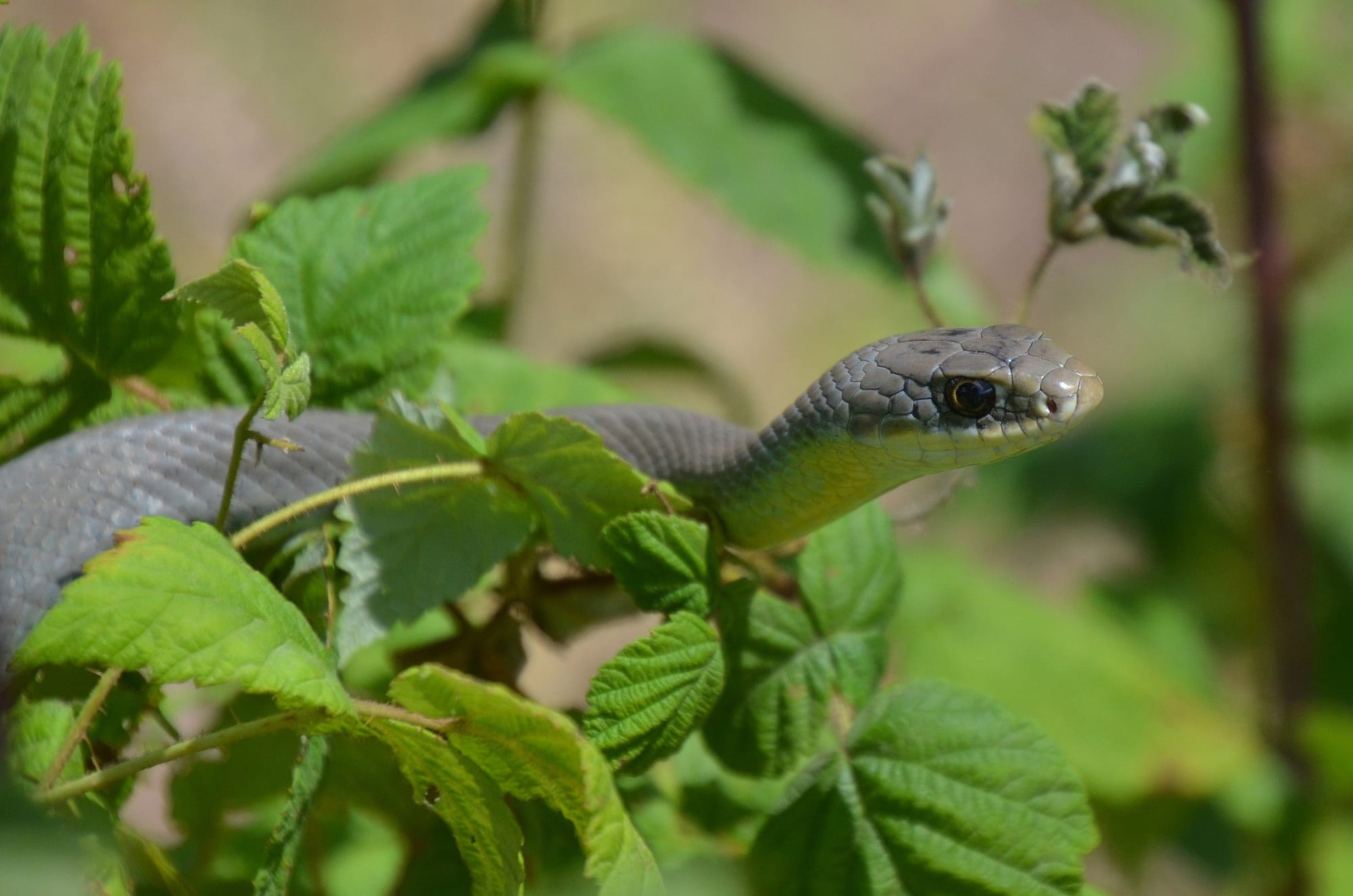 The uniformly patterned racer (photo by Tanja Thomas) compared to the yellow-striped pattern of a garter snake (photo by Shelley Khorrami).