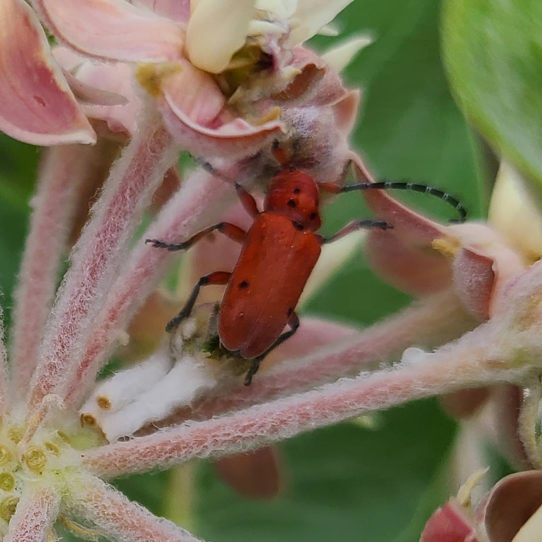 Many animals show red colors so it was fun to see two very different examples this week. One example was a commonly seen jumping spider with a flamboyant red pattern (this might be Phidippus johnsoni but there are several similar species), and the other is the red milkweed beetle (Tetraopes tetrophthalmus) that you'll might notice if you look closely at some milkweed plants.