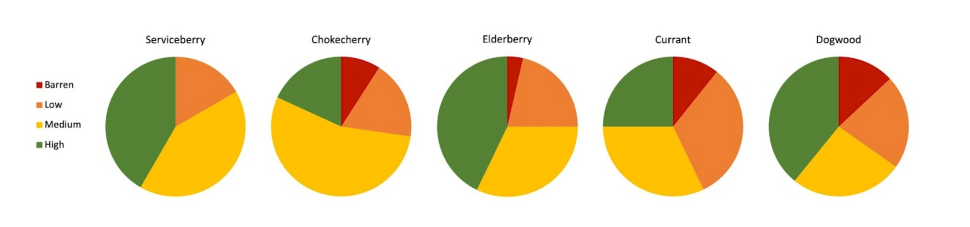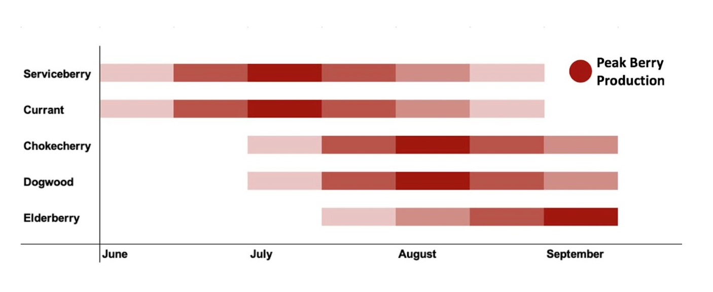 This diversity is further accentuated by the staggered cycles of berry production, with different species peaking at different times over the course of summer and fall. This means that vital sources of food are available for both growing babies and adults fattening up for migration and long winters.