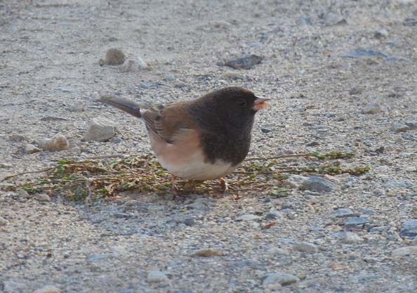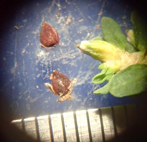 Junco eating knotgrass seeds, and a microscope view of the seeds (scale is 1mm). Photos by Dana Visalli