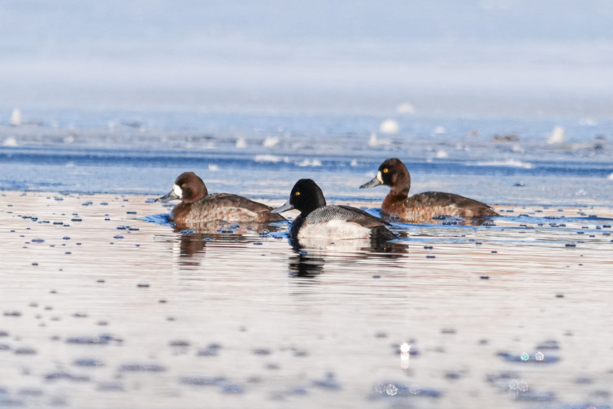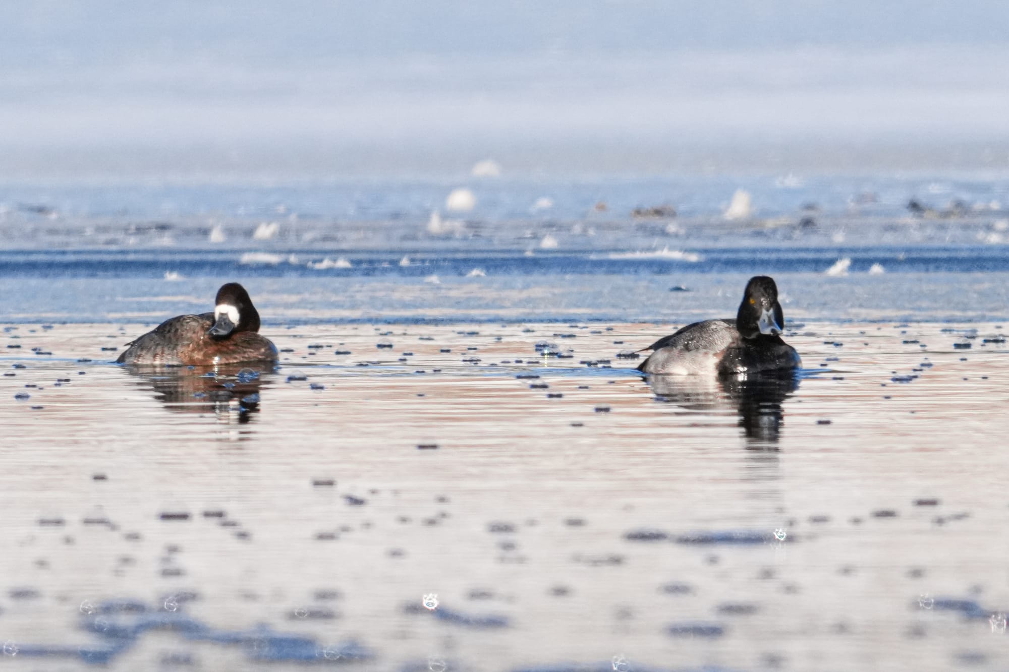 Greater and lesser scaup are challenging to identify. Key marks on these lesser scaup include the slight peak on their heads, and the very narrow (lesser) black nail on the tip of the male's bill. Photo by David Lukas
